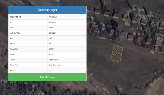 Özellikler: Kütahya ili Emet ilçesi Bahatlar Mahallesi 130 ada 93 parsel konumlu taşınmaz 308 m2 yüzölçümlü olup tapu vasfı "Arsa"dır. Taşınmaz geometrik olarak düzgün formludur. Taşınmazın yer aldığı parselin yakın çevresinde yapılaşma olduğu görülmektedir. 2 katlı Konut İmarı mevcuttur.