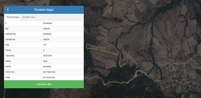 Özellikler: Çanakkale İli, Lapseki İlçesi, Çataltepe Köyü, Çamdere Mevkii adresinde kain, tapuda Lapseki İlçesi, Çataltepe Köyü, 147 Ada 8 Parsel, 18.614,59 m² yüzölçümlü, tarla vasıflı taşınmazdır.