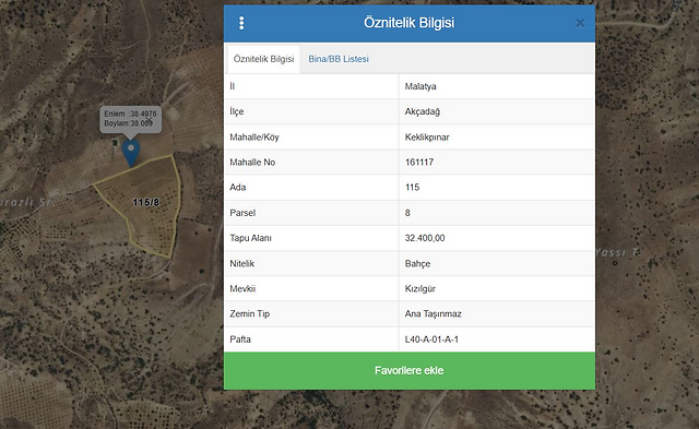 Özellikler: Taşınmaz 32.400 m² yüzölçümlü bahçedir. Geometrik olarak düzgün bir şekle sahip değildir. Parsel eğimli topoğrafyaya sahiptir. Bu eğim parsel tarımsal kullanımı kısıtlayabilecek durumda değildir. Üzerinde yaklaşık 100 adet 1-10 yaşında kayısı fidanı ve ağacı bulunmaktadır. Parselin sulama imkanı olduğu bilinmektedir. Kadastral incelemelere göre parsel yolu bulunmamakta olup mevcut durumda komşu parseller üzerinden açılmış olan yollar vasıtası ile ulaşım sağlanabilmektedir.