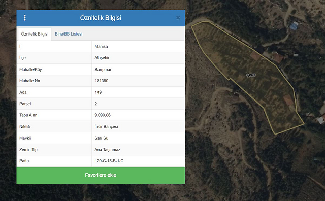 Özellikler: Manisa İli, Alaşehir İlçesi, Sarıpınar Mahallesi sınırları dahilinde yer alan 149 ada 2 parsel numaralı tapu kaydında ve mahallinde incir bahçesi vasıflı taşınmazdır.
