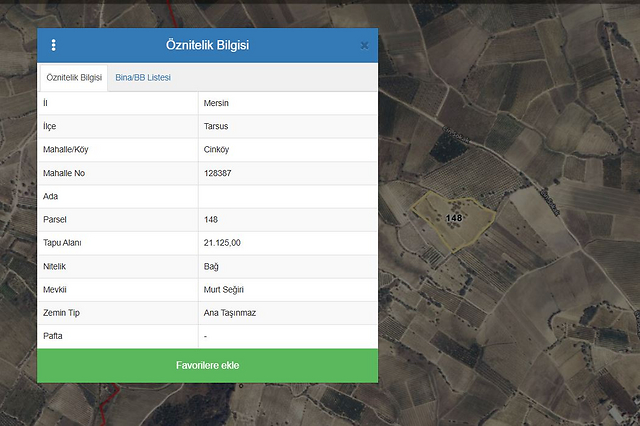 Özellikler: Mersin ili, Tarsus ilçesi, Cinköy Mahallesi sınırları içerisinde, Murt Seğiri mevkiinde yer alan 148 nolu parseldir. Konu taşınmaz; 21.125 m² yüz ölçümüne sahip bağ vasıflı taşınmazdır. Parsel belediye sınırları içerisinde yer almaktadır. İlgili kurumdan alınan çapa göre parselin yol cephesi bulunmamakta, tüm cephelerinde komşu parseller yer almaktadır. Parsel topoğrafik olarak hafif eğimli bir zemin yapısına sahip olup geometrik olarak düzgün dörtgen formunda değildir. Üzüm bağı bulunduğu görülmüş, ilgili kişiden bağın verimden kesilmesi nedeniyle parsel üzerindeki dikili köklerin sökülmesi gerektiği bilgisi edinilmiş, Taşınmazın konumlu olduğu bölgede sulama imkanları bulunmakta olup parsel üzerinde herhangi bir sulama sistemi bulunmamaktadır. Mahallinde parsel sınırlarını belirleyici bir unsura rastlanmamıştır.