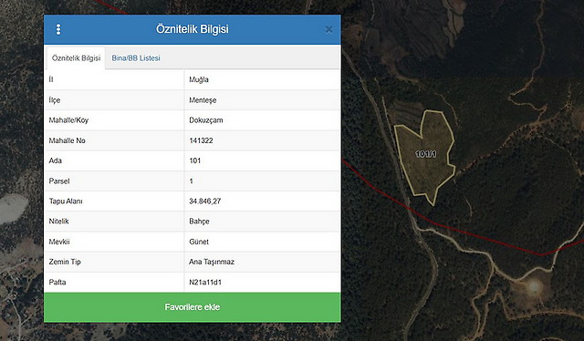 Özellikler: Dokuzçam Mahallesi, Günet Mevkii, 101 ada 1 parsel, Menteşe/MUĞLA adresinde bulunmaktadır. Bahçe vasfında olup, 34.846,27 m2 yüzölçümlüdür. Etrafında çam ormanları bulunmaktadır. Kadastral yola cephesi yoktur. Şenyayla Mahallesine yaklaşık 2.5 km., Dokuzçam Mahallesi’ne yaklaşık 2 km., Muğla Merkez’e yaklaşık 39 km. mesafededir. Eğimli bir arazi üzerinde bulunmaktadır. Komşu parseli olan 2 nolu parselde zeytin ağaçları bulunmaktadır. Diğer komşu parsellerinde çam ormanı bulunmaktadır. Konu parselin büyük bir kısmında çam ağaçları bulunmaktadır. Parselin batı cephesinin bir kısmında tel örgü bulunmakta olup, diğer kısımlarda tel örgü görülememiştir.