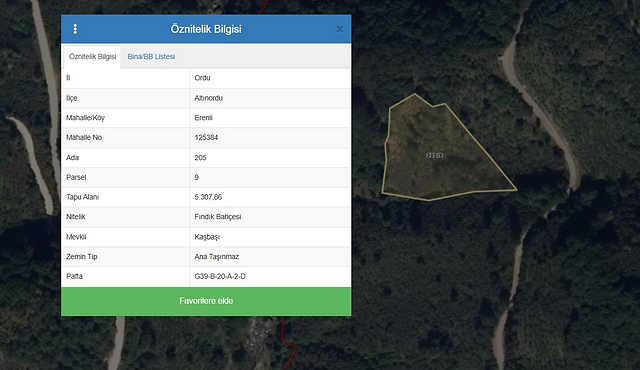 Özellikler: Ordu İli, Altınordu İlçesi, Erenli Mahallesi dahilinde, Kaşbaşı mevkiinde, 205 ada 9 parselde, 5.307,86 m² yüzölçümlü, “Fındık Bahçesi” nitelikli gayrimenkuldür. Topografik olarak eğimli bir arazi yapısına sahiptir. Geometrik olarak amorf formdadır. Kadastral paftasında yola cepheli olmayıp, taşınmaza ulaşım komşu parsellerden sağlanmaktadır. Konumlu olduğu bölgede elektrik ve temiz su altyapısının mevcut olduğu görülmüştür. Parselin sınırlarını çevreleyen herhangi bir unsur görülememiştir.