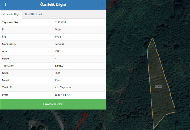 Özellikler: Söz konusu taşınmaz, Ordu İli, Ünye İlçesi, Tekkiraz Mahallesi dahilinde, Kıran mevkiinde, 4391 ada 4 parselde, 5.585,27 m2 yüzölçümlü, “Fındık Bahçesi” nitelikli gayrimenkuldür. Topografik olarak çok eğimli bir arazi yapısına sahiptir. Geometrik olarak amorf formdadır. Kıran Küme Evler’e kuş uçuşu 200 metre mesafede konumludur. Kadastra paftasında yola cepheli olup mahallinde yolu olmadığı tespit edilmiştir. Taşınmaza ulaşım tarım araçları komşu parseller dahilindeki fiili yoldan sağlanmaktadır. Konumlu olduğu bölgede elektrik ve temiz su altyapısının mevcut olduğu görülmüştür. Parselin sınırlarını çevreleyen herhangi bir unsur görülememiştir.