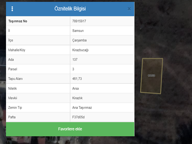 Özellikler: Taşınmaz arsa vasıflı 461,73 m2 yüz ölçümlü 137 ada 3 parseldir. 137 ada 3 parsel batıda 137 ada 2 parsele, güneyde 137 ada 8 parsele, doğuda 137 ada 4 parsele, kuzeyde imar yoluna cephelidir. Parselin kuzey, batı ve doğu yönünde imar yolları henüz açılmamış olup sınırlarını belirgin kılacak herhangi bir unsur bulunmamaktadır. Taşınmaz biçimsiz dikdörtgen formunda olup, düz bir arazide yer almaktadır. Taşınmazın üzerinde herhangi bir yapı bulunmamaktadır. Bölgede her türlü alt yapı hizmeti bulunmaktadır.
