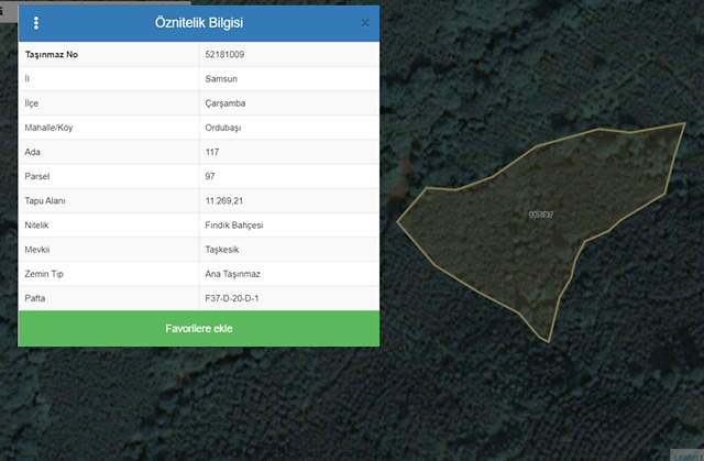 Özellikler: Samsun ili, Çarşamba ilçesi, Ordubaşı Mahallesi, Taşkesik Mevki, 117 ada 97 parselde yer alan 11.269,21 m2 alanlı "FINDIK BAHÇESİ" nitelikli taşınmaz, köy yerleşik alanı sınırları dışındadır. Taşınmazın kadastral yol cephesi yoktur. Komşu parseller ile çevrilidir. Geometrik olarak amorf bir yapıdadır. Topografik olarak eğimli bir yapıya sahiptir. Mevcutta üzerinde fındık ağaçları bulunmaktadır.