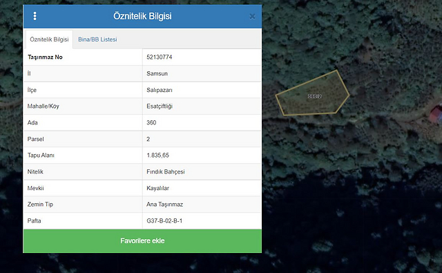 Özellikler : Gayrimenkul Samsun İli, Salıpazarı ilçesi, Esatçiftliği Mahallesi, Kayalılar Mevki 360 ada 2 parselde yer almaktadır. 1.835,65 m2 yüzölçümlü “FINDIK BAHÇESİ” vasıflı taşınmazdır. Parsel geometrik olarak yamuk biçiminde ve eğimli bir topoğrafyaya sahiptir. Taşınmazın güneydoğu, güneybatı ve güney cephelerinden orman çevreli kuzeybatı ve kuzeydoğu yönlerden komşu parseller ile çevrilidir. Parsel sınırları yerinde belirsizdir. Parsel üzerinde fındık dikilidir