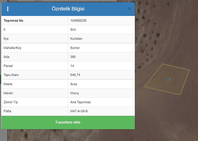 Özellik: Taşınmaz Siirt ili, Kurtalan ilçesi, Sümer mahallesi sınırları içerisinde konumlanan arsa vasıflı taşınmazdır. Parsel üzerinde herhangi bir yapı ve yapılaşmaya engel fiziki bir unsur bulunmamaktadır. Taşınmaz düz bir arazi yapısına sahip olup geometrik olarak kareye benzer bir şekildedir. Taşınmaz boş arsa durumundadır. Parselin sınırlarını belirleyici herhangi bir unsur bulunmamaktadır.