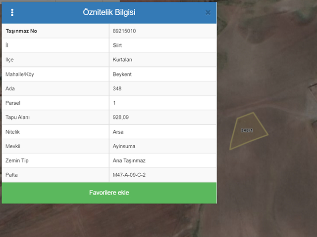 Özellikler: Siirt ili, Kurtalan ilçesi, Beykent mahallesi, 348 ada 1 parselde yer alan taşınmaz 928,09 m2 alanlıdır. Taşınmaz üzerinde herhangi bir yapı veya meyve ağaçları bulunmamaktadır. Hafif eğimli topoğrafik yapıya sahiptir. 348 ada 1 nolu parselin yol cephesi yaklaşık 45 m, derinliği uzun olan cephede 28 m’dir.