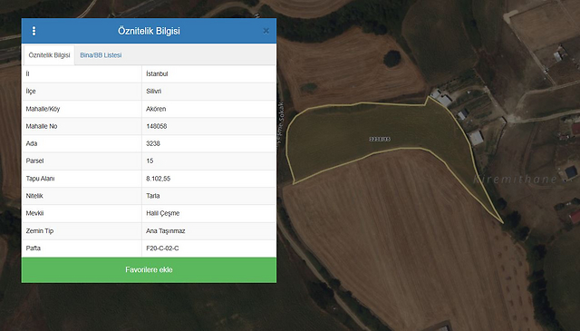 Özellikler: İstanbul İli, Silivri İlçesi, Akören Mahallesi, Halil Çeşme Sokak, 3238 Ada, 15 Parsel posta adresinde konumludur.