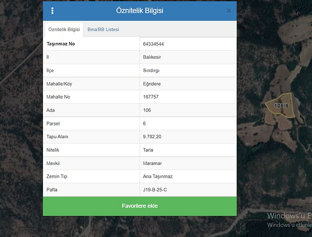 Özellikler: Taşınmaz Balıkesir Sındırgı Eğridere mahallesinde 106 ada 6 parselde konumlanmaktadır. Tapu vasfı ' TARLA ' olup 9782,20 m2'dir.