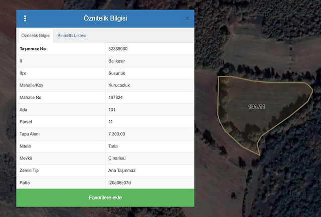 Özellikler: Taşınmaz Balıkesir Susurluk Kurucaoluk mahallesinde 101 ada 11 parselde konumlanmaktadır. Tapu vasfı 'TARLA' olup 7.300 m2'dir. Parsel amorf şeklindedir. En yakın köy merkezine uzaklığı 1,5 km'dir.