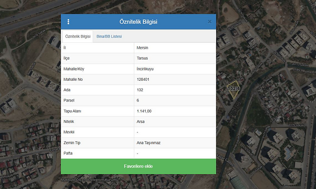 Özellikler: Mersin İli, Tarsus İlçesi, İncirlikuyu Köyü sınırları dahilinde yer almaktadır. 132 ada 6 parsel 1.141,00 m2 alanlı ve arsa vasfında olup, amorfa benzer bir geometriye sahiptir. Parselin doğu cephesi yaklaşık 25,1 mt, güney yönünden 38,2 yola cephelidir. Parsel eğimsiz topografik yapıya sahiptir. Taşınmaz imar paftası ve parselasyon planına göre köşe parselde konumludur. Parsel çevresi yerinde fens tel ile çevrilidir. Taşınmaz üzerinde diğer hissedarların kullanımında olan ruhsatsız olarak inşaa edilmiş müstakil yapılar bulunmaktadır. Söz konusu yapıların içerisi görülemediği için kullanım durumu ve özellikleri hakkında bilgi sahibi olunamamıştır
