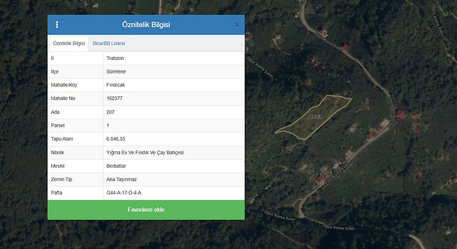 Özellikler: Trabzon İli, Sürmene İlçesi, Fındıcak Mahallesi Berbatlar Mevkii, 207 ada 1 parseldeki konumlu taşınmaz, 6.046,35 m² yüzölçümlü olup tapu kayıtlarında ‘’ YIĞMA EV VE FINDIK VE ÇAY BAHÇESİ’’ vasıflıdır. Taşınmazın imar uygulaması henüz yapılmamış olup, kadastro parselidir. Taşınmazın çevresinde hepsi tam açılmamış kadastro yolları bulunmaktadır. Bu yolların arkasında 101/1(Orman), 190/2, 208/2-3, 209/7, 205/7, 206/1 numaralı kadastro parselleri ile çevrilidir. Köy yoluna kuş uçuşu 100 m mesafededir. Geometrik olarak amorf bir forma sahip olan taşınmazın bulunduğu bölgenin topografik yapısı çok eğimlidir. Taşınmaz üzerinde kadastro paftasına işli 36,25 m2 yapı bulunmaktadır. Köy asfalt yolundan yapılan gözlemde yapı bulunmamaktadır. CBS uydu görüntüsünde de yapı gözükmemektedir. Uzaktan yapılan gözlemde parsel üzeri Ormanlık olduğu görülmektedir.