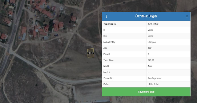 Özellik: Uşak ili, Eşme ilçesi, İstasyon Mahallesi 1231 ada 3 parsel konumlu, arsa vasıflı taşınmaz 345,29 m2 yüzölçümlüdür. Yerleşim alanı içerisinde kalmaktadır, elektrik ve su altyapısı mevcuttur. Taşınmazın resmi imar yolu bulunmaktadır ve düzgün geometrik formludur. Taşınmaza ait yapılaşma koşulları TAKS 0,30 KAKS 0,60 h:6,50 m 2 kat konut imarlıdır.
