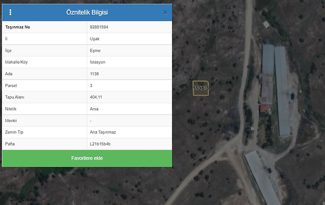 Özellik: Uşak ili, Eşme ilçesi, İstasyon Mahallesi 1136 ada 3 parsel konumlu, arsa vasıflı taşınmaz 404,11 m2 yüzölçümlüdür. Yerleşim alanı içerisinde kalmaktadır, elektrik ve su altyapısına 150 m mesafededir. Düzgün geometrik formludur. Taşınmaza ait yapılaşma koşulları TAKS 0,30 KAKS 0,60 h:6,50 m 2 kat konut imarlıdır.