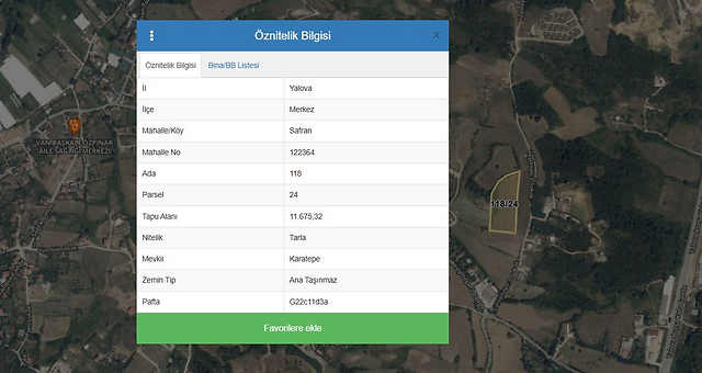 Özellikler: Yalova İli, Merkez İlçesi, Safran Köyü, Karatepe mevkii 118 ada 24 parsel 11.675,32 yüzölçümlüdür. 118 ada 24 parsel; doğu yönden 25 parsel, batı yönden 23 parsel, kuzey yönden 21 parsel, güney yönden 26 parsel ile çevrelenmiştir. Kısmen dikdörtgene benzer formdadır.