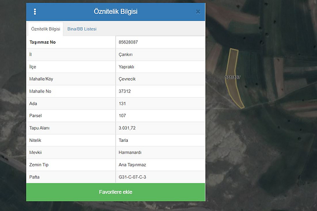 Özellikler: Taşınmaz Çankırı Yapraklı Çevrecik mahallesi 131 ada 107 parsel yer almaktadır. Tapu vasfı ' Tarla' olup 3.031,72 m2'dir. Amorf bir şekle sahiptir. En yakın köy merkezine 800 m uzaklıktadır.
